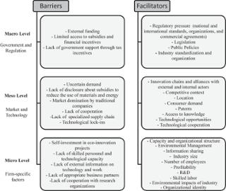Andersen and Foxon (2009) observe that eco-innovations are affected by the organization's internal and external elements. Such elements operate at different levels, from State powers to internal influences (Gunarathne, 2019). Considering the arguments of Hazarika and Zhang (2019), the multilevel methodology is a tool for assessing the performance levels of eco-innovation's barriers and facilitators.