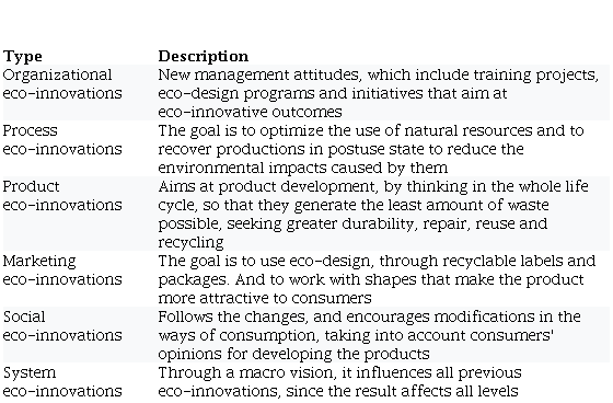 For eco-innovation to occur, it is necessary to recycle and reuse previous products, as well as to apply natural resources consciously to avoid waste. This production, based on the principle of reducing, reusing and recycling (3Rs), helps product development through efficient processes and clean technologies, generating savings and putting the company in the spotlight (Kiefer, Del Rio González, & Carrillo-Hermosilla, 2019; Porter & Van der Linde, 1995).