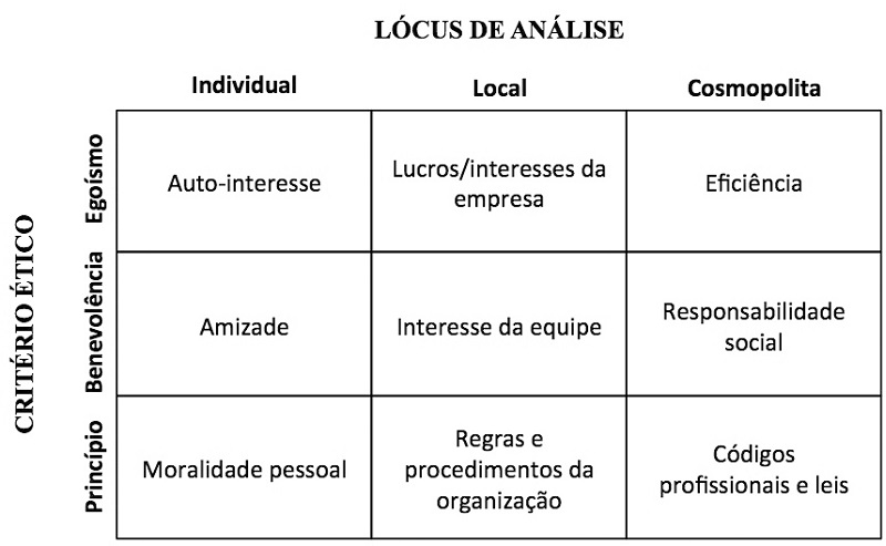 A partir dessa concepção, os autores apresentam uma tipologia que combina os três critérios éticos com os três loci de análise, resultando em nove quadrantes que eles denominam arquétipos de climas éticos. A representação gráfica desse esquema de arquétipos pode ser observada na Figura 1, a qual fora retirada da fonte original (Victor & Cullen, 1988, p. 104), com tradução livre do inglês para o português.