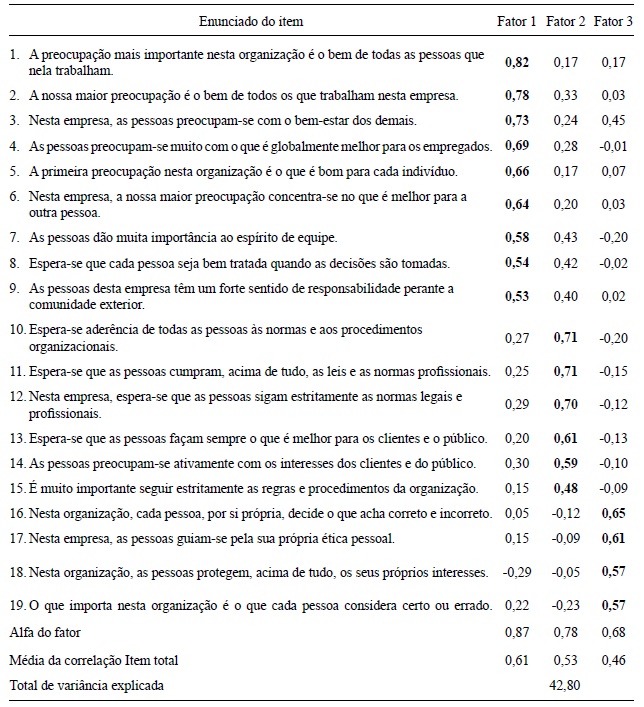 Para que a solução em três fatores seja considerada a mais adequada, houve necessidade de retirada de 17 itens. A sua saída obedeceu a aplicação de critérios como verificação da carga fatorial, complexidade e pertinência teórica. A definição de valor mínimo para a carga fatorial foi realizada seguindo as diretrizes dadas por Tabachnick e Fidell (2001), que alertam quanto ao fato de itens com cargas inferiores a 0,30 oferecerem contribuição pobre para a mensuração do aspecto focado pelo fator. Adicionalmente, foram retirados itens que apresentaram complexidade, o que significa dizer que possuem cargas fatoriais superiores a 0,30 em mais do que um fator e com diferença ente elas inferiores a 0,1. Por fim, a análise da convergência teórica esteve presente na verificação do atributo da organização que era focado pelo conjunto de itens (fator). Os itens destoantes desse foco foram retirados.