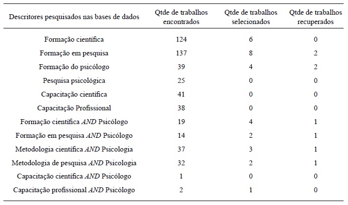 Com base no tema escolhido foram definidos os seguintes descritores nas bases de dados: formação científica, formação em pesquisa, psicologia, psicólogo, formação do psicólogo, pesquisa psicológica, metodologia científica, metodologia em pesquisa, capacitação científica, capacitação profissional. Foram pesquisados trabalhos que continham tais termos em qualquer parte do texto. Os termos foram pesquisados sozinhos e em busca realizada por meio de operadores booleanos, no modo de "pesquisa avançada" das bases de dados, a fim de refinar os resultados da pesquisa de acordo com o objetivo do trabalho.