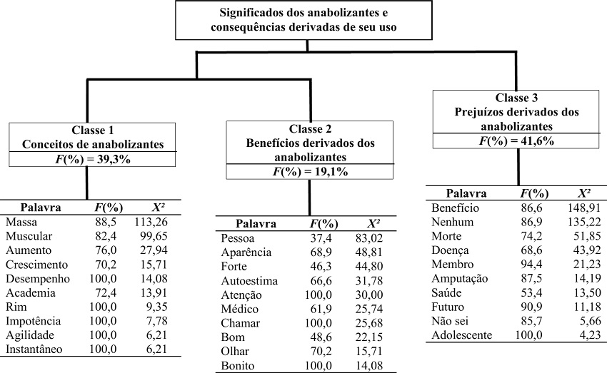 O corpus analisado obteve 508 UCI (questionários), 16.882 ocorrências (número de palavras), e frequência de 4,9 palavras por resposta. O dendograma foi formado por 3 classes temáticas conforme as semelhanças entre os segmentos de texto, a saber: (a) Conceitos de anabolizantes, (b) Benefícios derivados dos anabolizantes, e (c) Prejuízos derivados dos anabolizantes (Figura 1).