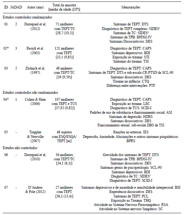 A qualidade metológica dos estudos selecionados para revisão são apresentadas na tabela 1 em conjunto com as características dos estudos. Entre os artigos selecionados para revisão, 3 eram estudos clínicos randomizados (Cohen & Hien, 2006; Dorrepaal et al., 2012; Resick, Nishith, & Griffin, 2003; Zlotnick et al., 1997), 2 eram estudos clínicos não randomizado (Trappler & Newville, 2007) e 2 eram estudos não controlados (D'Andrea & Pole, 2012; Dorrepaal et al., 2010). A escala JADAD foi utilizada para avaliação dos quatro estudos que possuíam desenhos de estudos clínicos randomizados. No que se refere as características dos estudos, foram reportadas informações sobre o sexo, idade e dignóstico psiquiátrico de todos participantes do estudo. Além disso, foram descritos os sintomas avaliados, bem como os intrumentos utilizados para a avaliação. Somente dois estudos (Dorrepaal et al., 2010; Dorrepaal et al., 2012) utilizaram um instrumento próprio para avaliação de sintomas de TC, a SIDES. Os demais estudos consideraram como parâmetro de avaliação dos sintomas de TC o resultado proveniente de diferentes escalas de sintomas psiquiátricos, como escalas de sintomas pós-traumáticos, de depressão, ansiedade, impulsividade, dissociação, funcionamento sexual, queixas somáticas, funcionamento cognitivo e padrão de uso de substância. Especificamente, para avaliação dos sintomas pós-traumáticos houve uma variabilidade nos instrumentos selecionados pelos estudos, sendo a Davidson Trauma Scale (DTS) e a Clinical Administered PTSD Scale (CAPS) os instrumentos mais frequentemente utilizados (n = 3). As outras escalas utilizadas foram a Trauma Symtom Inventory (TSI), Impact of Event Scale (IES) e a Posttraumatic Stress Disorder Checklist (PCL).