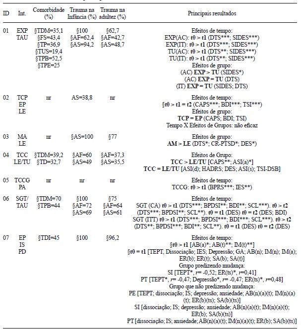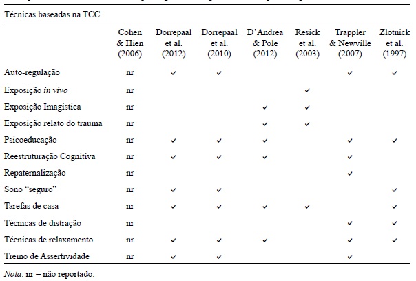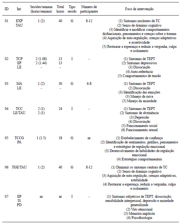 Os estudos de Dorrepaal (Dorrepaal et al., 2010; Dorrepaal et al., 2012), Trappler e Newville (2007) e Zlotnick et al. (1997) adotaram distintos protocolos de TCC para grupos. Dorrepall seguiu uma adaptação do protocolo proposto por Zlotnick et al. (1997), que possui o objetivo de estabilizar a sintomatologia associada ao trauma, aumentando a capacidade do indivíduo em tolerar emoções intensas. Já o estudo de Trappler e Newville (2007), baseou sua intervenção no protocolo STAIR (Skill Training in Affect Regulation) desenvolvido por Cloitre, Cohen e Koenen (2006). Embora as intervenções sejam distintas no que se refere a sua estrutura e tempo de duração, ambas estão direcionadas principalmente para o aumento da capacidade de regulação emocional dos indivíduos diagnosticados com TC, além da identificação e modificação de cognições e comportamentos disfuncionais. Ainda, estes estudos, com excessão de Zlotnick et al. (1997), tiveram grupos controle ativos baseados em tratamentos usuais e terapia de suporte como parâmetros de comparação. As intervenções individuais adotadas pelos estudos de Cohen e Hien (2006), D'Andrea e Pole (2012) e Resick et al. (2003) e objetivaram a redução dos sintomas de TC, como sintomas depressivos, dissociativos, de ansiedade, disfuncionalidade sexual e alterações nas funções cognitivas relacionadas a atenção e memória. Em razão das comorbidades entre dependência de substâncias e TEPT com manifestação clínica de TC entre os participantes do estudo de Cohen e Hien (2006), a intervenção baseou-se no tratamento simultâneo de ambos os transtornos e na prevenção de recaídas. Além disso, procurou identificar os gatilhos e estratégias de coping para manejo da físsura e das recaídas. D'Andrea e Pole (2012) e Resick et al. (2003), por sua vez, adotaram protocolos de TCC consolidados para tratamento de indivíduos que experienciaram situações traumáticas, incluindo intervenções baseadas na exposição prolongada, terapia cognitiva processual e inoculação de estresse.