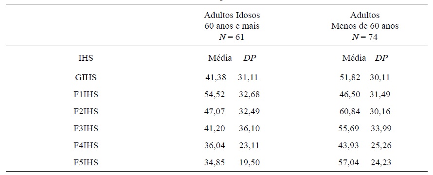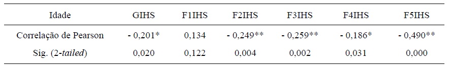 Esses resultados sugerem que as HS em termos gerais, e nos respectivos fatores, encontram-se menos desenvolvidas nos participantes idosos, quando comparadas às habilidades dos adultos não idosos. Na sequência, será demonstrado os resultados das análises de correlação de Pearson entre o IHS-Del Prette e a idade dos participantes.