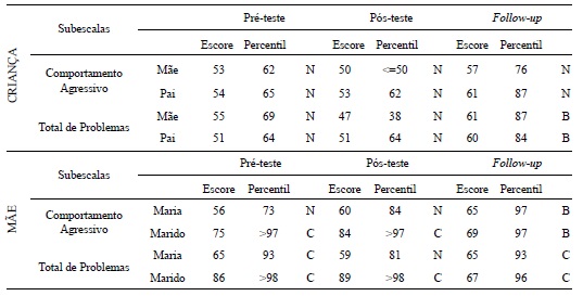 A Tabela 1 a seguir apresenta os resultados da mãe e da criança nos instrumentos do sistema ASEBA. Houve concordância entre o relato dos pais quanto à avaliação da criança no CBCL. A criança apresentou escores em nível não-clínico no pré-teste quanto ao comportamento agressivo, mantendo tal nível ao longo de todo o estudo (pós-teste e follow-up). Quanto ao escore total de problemas, esses foram mantidos em nível não-clínico no pós-teste, havendo uma queda para a faixa limítrofe na fase de follow-up.
