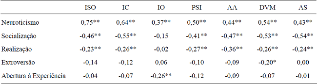 Para verificar a validade convergente, correlações entre os fatores do IPO-Br e da BFP foram estimadas, conforme apresentado na Tabela 2. Foram encontradas correlações positivas, fracas a altas, entre todos os fatores do IPO-Br com o fator Neuroticismo. Também foram observadas correlações negativas de magnitude fraca a moderada com o fator Socialização e correlações negativas fracas, porém significativas, com o fator Realização. Correlações negativas de baixa magnitude ou sem significância estatística foram observadas com os fatores Extroversão e Abertura à Experiência.