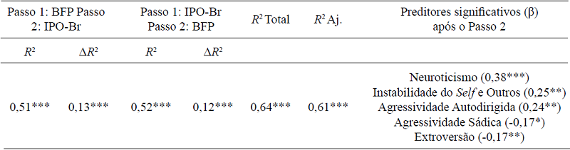 Para investigar a validade incremental do IPO-Br, foram realizadas regressões lineares hierárquicas (Dancey & Reidi, 2013). Na primeira análise, as dimensões da BFP foram colocadas no primeiro bloco e as do IPO no segundo, para verificar se os fatores do IPO forneciam informação adicional para a predição de sintomas psicopatológicos, medidos pelo SRQ-20, para além da informação obtida pelos fatores da BFP.