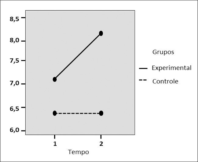 No que diz respeito à percepção de desenvolvimento profissional, a ANOVA indicou que a interação entre grupo e tempo foi significativa, com escores dos participantes do PJA maiores após seis meses no Programa, quando comparados escores do grupo controle decorrido o mesmo intervalo temporal (Tabela 3), sendo, portanto, verificada diferença significativa entre o pré e o pós-teste nos grupos experimental e controle, F(1) = 42,07; p < 0,01. Apesar de ser observada uma diferença inicial entre os escores de desenvolvimento profissional dos grupos experimental e controle, os resultados indicaram uma significativa acentuação dessas diferenças após seis meses de participação ou não no Programa (Figura 1), ficando o grupo controle com escores estáveis, enquanto o grupo experimental apresentou elevação dos escores de desenvolvimento profissional.