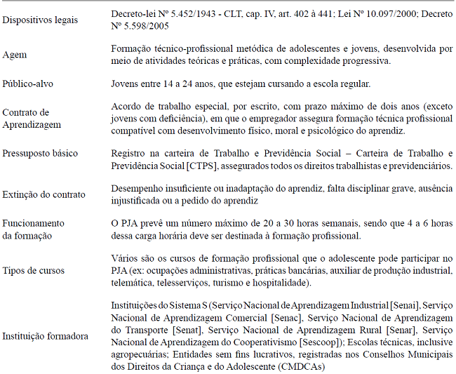 O Programa da Lei da Aprendizagem, conhecido como Programa Jovem Aprendiz - PJA, objeto de estudo do presente artigo, caracteriza-se por promover a inserção laboral de adolescentes e jovens no mundo do trabalho, com a exigência de manutenção do participante na escola. O Programa é vinculado ao Ministério do Trabalho e Emprego - MTE, que estabelece as relações jurídicas, incluindo a prestação de serviços e o contrato de aprendizagem. O PJA considera os dispositivos da Consolidação das Leis Trabalhistas - CLT (Decreto-lei N° 5.452, 1943; MTE, 2014) e do Estatuto da Criança e do Adolescente - ECA (Lei Nº 8069, 1990) para garantir o direito do jovem à profissionalização e prevê o trabalho com uma formação técnico-profissional compatível com o desenvolvimento físico, moral e psicológico do adolescente (MTE, 2014; Oliveira, 2009).