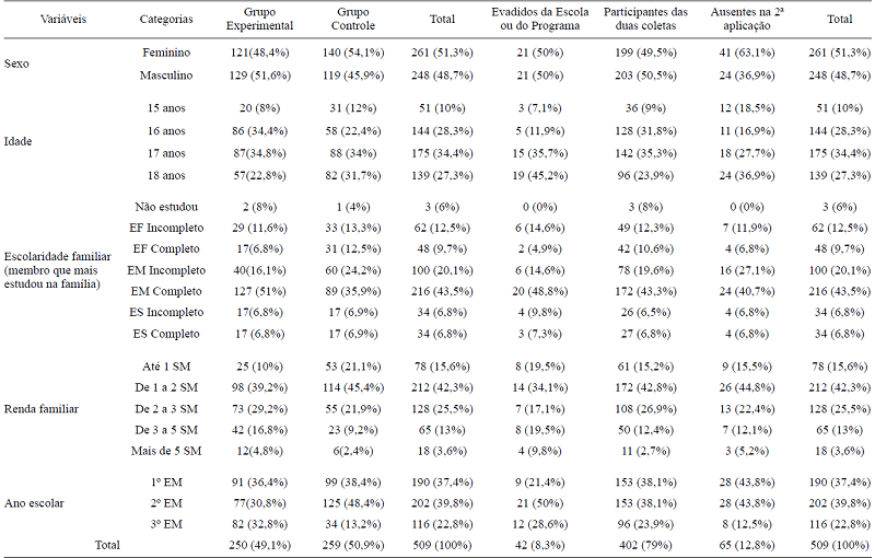 A amostra total foi de 509 jovens, de ambos os sexos, sendo 250 participantes do PJA e 259 adolescentes que compuseram o grupo controle. A distribuição amostral foi de 51,3% mulheres e a idade variou de 15 anos (10%) a 18 anos (27,3%), com concentração entre 16 e 17 anos (62,7%). O maior percentual de pesquisados concentrou-se no primeiro e segundo anos do Ensino Médio (77,2%) e a escolaridade familiar indicou predomínio de pelo menos um membro da família com Ensino Médio completo (43,5%) ou incompleto (20,1%).