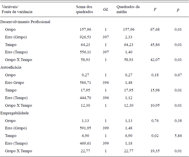 A tabulação e a análise dos dados quantitativos foram realizadas com o auxílio do Software Statistical Package for Social Science - SPSS, versão 21.0. Para verificar a existência de diferenças entre as medidas de desenvolvimento profissional, empregabilidade e autoeficácia utilizadas no pré e pós-teste, foi realizada uma ANOVA mista 2 (grupo) X 2 (tempo). Antes de analisar a ANOVA propriamente dita, foi feito o exame dos pressupostos para esse tipo de teste. Nesse sentido, verificou-se inicialmente que as variáveis dependentes (desenvolvimento profissional, empregabilidade e autoeficácia) eram normalmente distribuídas, que as variâncias dos grupos eram homogêneas e que não havia a presença de outliers (escores extremos) em nenhuma das distribuições, o que evidenciou a pertinência da ANOVA ser adotada na comparação entre as médias dos grupos experimental e de controle.