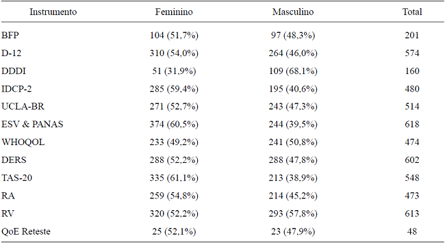 Os convites para participação na pesquisa foram feitos por meio de redes sociais, sendo disponibilizado o link de acesso para quem se interessasse. Seguindo recomendações internacionais para testagem informatizada (International Test Commission, 2005), apenas o Termo de Consentimento Livre e Esclarecido (TCLE) era mostrado inicialmente, e o participante concordava em participar criando um usuário e senha para acessar o sistema. A partir do cadastro, os testes eram apresentados. Como a quantidade de instrumentos era grande, a aplicação foi espiralada da seguinte maneira: o QoE sempre era o primeiro teste disponível a ser respondido, enquanto havia rodízio para os testes seguintes. De fato, nenhum participante respondeu todos os testes, sendo que 43,8% respondeu três ou mais testes (incluindo o QoE) e 18,0% respondeu quatro ou mais testes (incluindo o QoE). Como consequência desse modelo de aplicação, espera-se ter evitado efeito de cansaço e reduzido erros estatísticos de tipo I e II, contudo a quantidade de participantes que respondeu os outros testes foi variada. A Tabela 1 apresenta a distribuição de participantes de acordo com o segundo teste respondido. Buscou-se manter distribuição semelhante de idades e de sexo. Apenas no caso do DDDI houve maior discrepância, com 68,1% de homens. Já no caso da BFP, a aplicação foi feita com estudantes universitários de diversos cursos da Universidade Estadual de Londrina. O convite foi feito via redes sociais e os estudantes responderam o QoE online e a BFP pessoalmente na versão impressa.