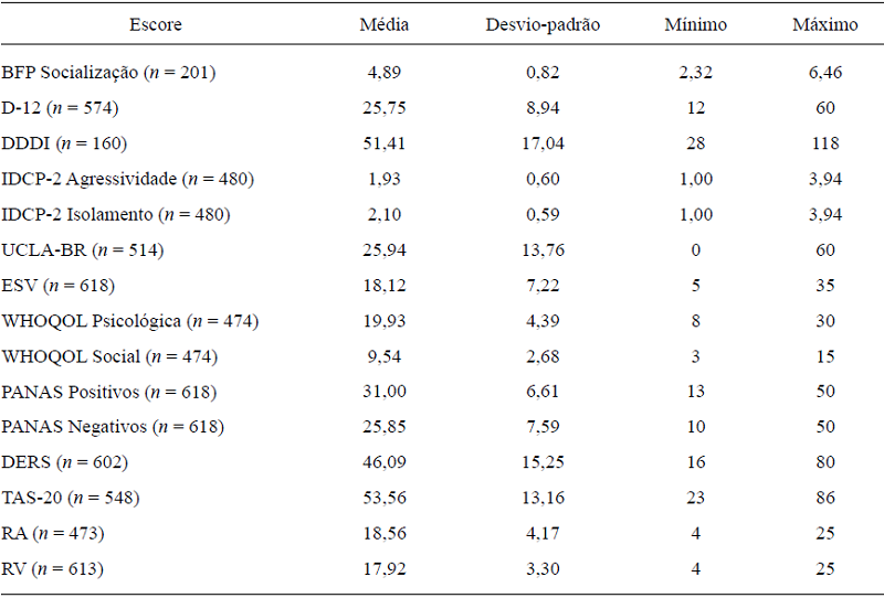 As estatísticas descritivas dos instrumentos utilizados nesta pesquisa estão apresentadas na Tabela 2. Os três escores fatoriais e o escore geral do QoE apresentaram média 0,00 e desvio-padrão 1,00 pois foram transformados em escores z. No que diz respeito aos testes que dispõem de normatização brasileira (i.e., RA, RV, BFP, DERS, IDCP-2 e TAS-20), a amostra desta pesquisa tendeu a apresentar médias próximas das esperadas, com exceção apenas para o fator Socialização da BFP, em que os participantes apresentaram médias moderadamente mais baixas (d = 0,54). Não obstante, em todos os testes a amplitude de respostas tendeu a ir desde a pontuação mínima até a máxima possível.