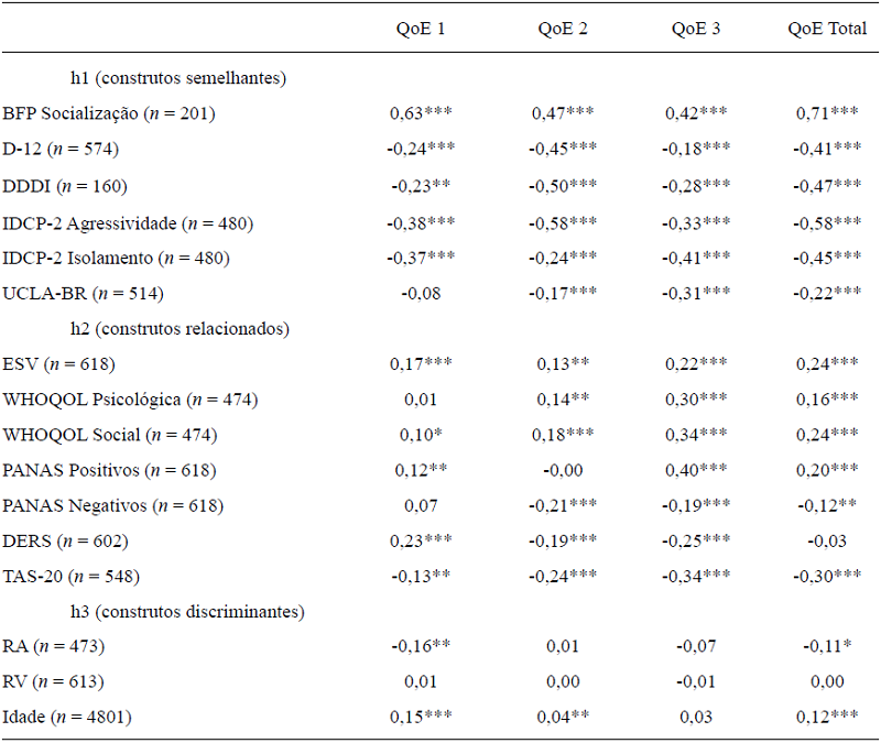 De maneira geral, foram encontradas evidências de validade para o QoE, mostrando que o construto avaliado se correlacionou fortemente com diversos aspectos de pró-sociabilidade (positivamente com agradabilidade, e negativamente com tríade sombria, direção perigosa, agressividade e isolamento social), correlacionou-se levemente com construtos associados (positivamente com qualidade e satisfação de vida e regulação emocional, e negativamente com alexitimia e afetos negativos) e correlacionou-se em nível próximo do nulo com medidas discriminantes (inteligência e idade). Além disso, destaca-se que os fatores de empatia podem estar mais ou menos relacionados a outros aspectos psicológicos, sendo recomendada a avaliação que leve em conta todos os escores para maior riqueza de informação.
