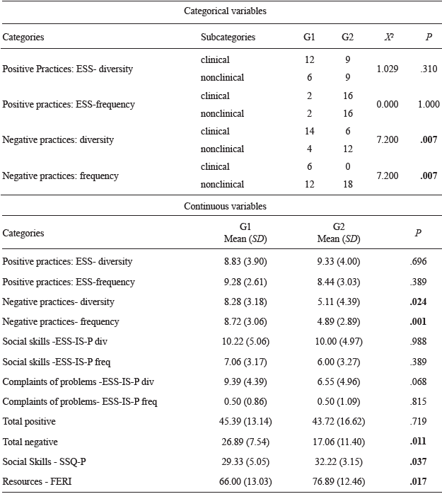 From Table 1 it can be seen that negative practices (hitting, cursing, fighting, punishment, withdrawing privileges, blackmail) differentiate the G1 and G2 groups, both in terms of diversity and behavioral frequency, which impacted on the negative total, which is the sum of these practices, with complaints of behavior problems. From the perspective of the SSQ-P, the boys with problems were less skilled. Regarding the environmental resources measured by the FERI, the clinical children presented lower mean values. Table 2 describes the comparisons between groups G1 and G2 regarding the parenting practices and the child’s behaviors.