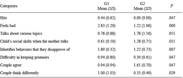 The ESS-IS-P items that differentiated the groups with and without behavior problems were identifying behaviors that they disapprove of, using the negative practice of hitting and feeling bad, all more frequent in the G1 group. On the other hand, in the nonclinical G2 group, the mothers talked about different topics and the children were more skillful at these times. Concerning the parental understanding in relation to raising the children, it was noted that in G1 there was more difficulty in fulfilling promises, less parental agreement and there were more reports that the couple think differently about raising the children. Although there were no differences between the groups, positive parenting practices had a higher mean values for the nonclinical G2 group. This information is presented to indicate trends in these groups evaluated regarding the Demonstration of affection: (a) Express positive feelings (G1=1.72; G2=1.94), Praise (G1=0.88; G2=1.17), Stimulate (G1=0.27; G2=0.44) Play (G1=0.28; G2=0.44); (b) Establish limits: Talk to express negative feelings (G1=0.38; G2=0.77), talk about right and wrong (G1=1.05; G2=0.72), give explanations (G1=0.22; G2=0.61), establish rules (G1=0.22; G2=0.67) and feel good about establishing limits (G1=0.27; G2=0.67).