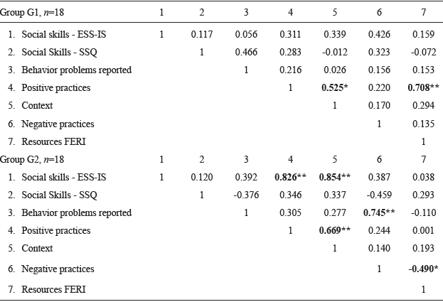 According to Table 3, differentiated patterns for groups G1 and G2 can be noted. In the Clinical G1 Group, there was a strong and very strong correlation between positive parental practices, diversity of interaction contexts and resources of the environment measured through the FERI. In the Nonclinical G2 Group the children’s social skills were very strongly correlated with positive practices and diversity of interaction contexts, while complaints of behavior problems were very strongly correlated with negative practices, with these negative practices having a negative and moderate correlation with resources of the environment.