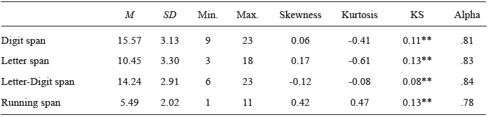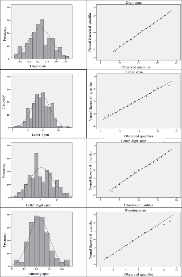 The score of each task was the total number of items recalled correctly. The analyzes showed all distributions were symmetrical and mesocuric even though the fit test for a normal distribution of Kolmogorov-Smirnov (KS) showed that the distributions were significantly different from the percentiles of a normal theoretical distribution (see Table 1). Nevertheless, a normal fit can be inferred by observing the histograms and the Q-Q plots (see Figure 1).