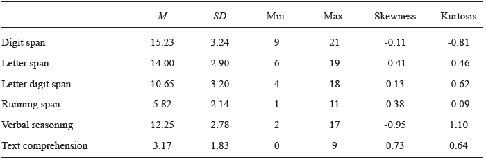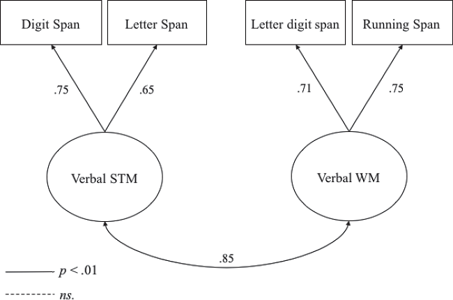 In order to verify the factor structure found in the exploratory factor analysis, confirmatory factor analysis was conducted (Arbuckle, 2014). The first factor saturated the Digit span and Letter span scores, and the second factor the Letter-Digit span and Running span scores.