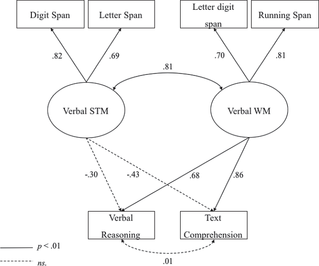 Finally, a full SEM analysis was conducted. Accordingly, a model of relationship between the components of working memory, verbal reasoning and text comprehension tests was proposed. The model included two latent factors: one that saturated short-term memory tasks scores and a second one that saturated working memory tasks scores with both factors that had a direct effect on the verbal reasoning and text comprehension tests scores; this is depicted in Figure 3.