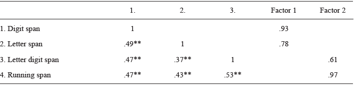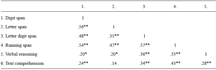 Pearson’s r-moment correlation showed significant associations of moderate intensity among all the verbal working memory tests (between r = .37 and r = .53; see Table 2).