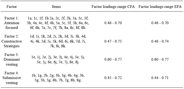 Following the same procedure used for the samples of mothers and fathers separately, the distribution of the items in the four factors originally proposed by the authors was assessed. There were no crossed loadings and all of the items showed loadings greater than 0.4 in the theoretically proposed factor, with the exception of item 1h which was eliminated. Factor 1 (Focus on attention) explains the 12% of the variance, factor 2 (Constructive strategies) the 11% of the variance and factor 4 (dominant venting) a 10% of the variance and factor 4 (Submissive venting) a 7% of the variance; the solution explains 39% of the total variance of the joint sample of mothers and fathers.