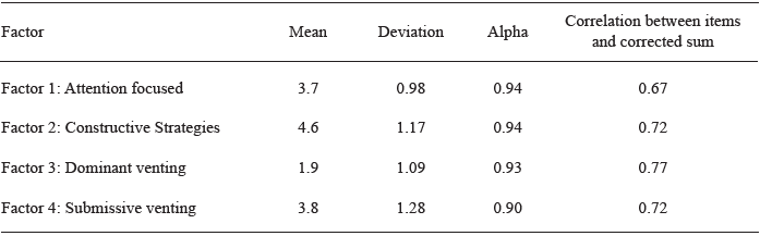 Thus, the final scale was made up of 85 items distributed in 4 factors that presented adequate levels of internal consistency (Table 2). Regarding the correlation between the score of the mothers and fathers, a correlation was found of r= 0.29 for the attention-focused factor, r=0.47 for the constructive strategies factor, r= 0.5 for the dominant venting factor and r=0.51 for the submissive venting factor.