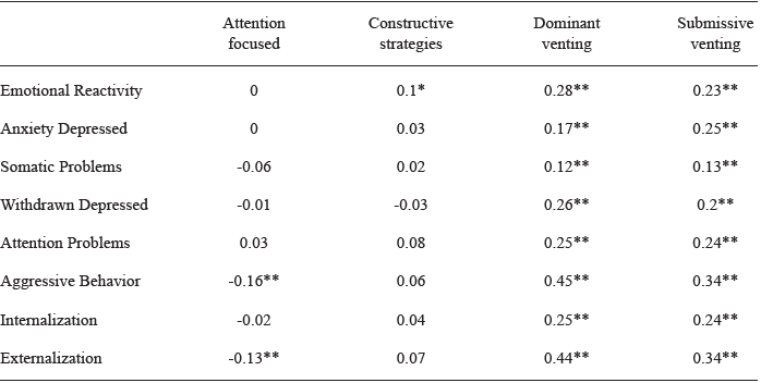 With regards to the relation of the distinct dimensions of CERP with the scales of CBCL, a positive and significant relation was found between the strategies of emotion regulation based on submissive and dominant venting and all of the scales of CBCL. At the same time, the data showed a negative and significant relation between the strategies of adaptive or age-appropriate regulations (distraction and constructive strategies) with the externalization and aggressive behavior scales. This shows coherence with what was stated in other studies that have linked the difficulties in emotion regulation and the use of instrumental strategies of emotion regulation (behaviors that look to eliminate the source of frustration) or expression of emotion with mental health issues, both internalized and externalized (Morris et al., 2011; Sanders et al., 2013; Suplee et al, 2011). The constructive strategies, as is expected, did not show relation with externalized nor internalized behaviors except for one very low relation with the emotion reactivity scale.