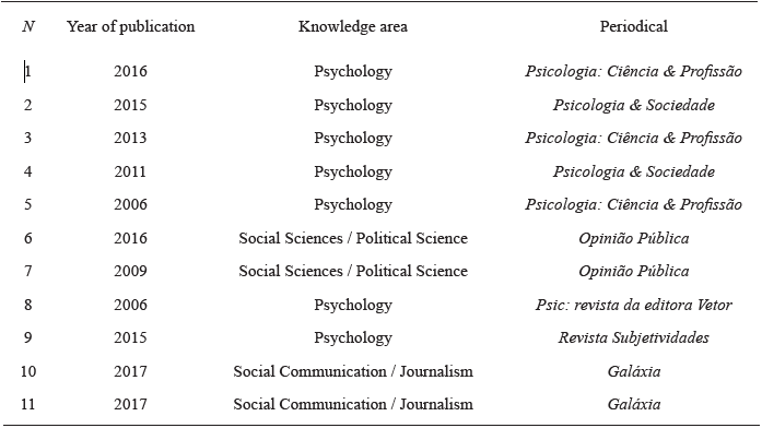 All the articles included belong to the Human and Social Sciences area of knowledge. Of these, seven were published in scientific journals of Psychology, two in journals of Social Communication and two in journals of Political Science. The Psychology studies were concentrated in the following categories: developmental psychology and morality (Cunha, Ropelato, & Alves, 2006; Galvão & Camino, 2011), social psychology (Corte Real & Conceição, 2013; Espíndula et al., 2006; Petry & Nascimento, 2016) and institutional analysis (Scisleski, Bruno, Galeano, Santos, & Silva, 2015; Silva & Hüning, 2015). The articles of Social Communication can be characterized as studies of the editorial organization of newspapers (Dias, 2017) and the interaction between communication and politics (Maia et al., 2017). The articles in Political Science are related to the analysis of the decision process (Campos, 2009) and public policies (Lins, Figueiredo, & Silva, 2016).