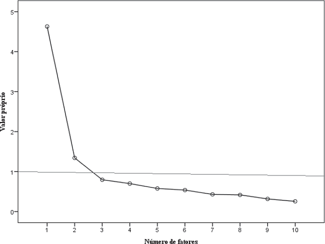 Having tested the discriminative power of the items, we sought to identify the EAPN-10's factor structure. First of all, we confirmed the adequacy of this type of analysis [KMO = 0.89 and Bartlett's Test of Sphericity χ² (45) = 1,191.00; p < .001], deciding to perform an analysis of the principal axes and adopting oblique rotation (Oblimin), without fixing the number of factors to be extracted. In this case, three criteria were adopted in order to make this decision: Kaiser, Cattell and Horn. According to the first criterion, two factors could be extracted, individually exhibiting values greater than 1 (4.63 and 1.34) and collectively explaining 59.7% of the total variance; considering the Cattell criterion, two factors that stood out could also be extracted (Figure 1); and, lastly, employing the Horn criterion, accepting the parameters of the database (296 participants and 10 items) and conducting 1000 simulations, the two-factor structure was corroborated, since the third empirical value (0.79) was less than the simulated value (1.13).