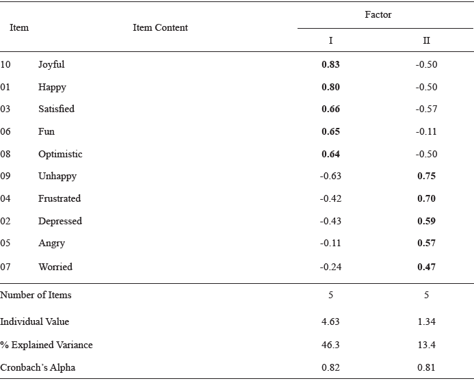 In light of the preliminary evidence, we decided to extract two factors, consistent with the nature of the affects. The factor structure is shown in Table 1. It is worth emphasizing that all of the items exhibit saturations equal to or greater than 0.40. As one observes in the table, the first factor encompasses the positive affects, its items presenting saturations between 0.64 (optimistic) and 0.83 (joyful), while the second factor contains the negative affects, whose items display saturations ranging from 0.47 (worried) to 0.75 (unhappy).