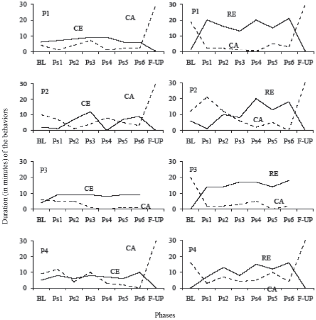 Figure 1 shows the duration, in minutes, of the occurrence of the behaviors of Copying the Exercise, Responding to the Exercise, Presenting the Exercise, and Competing Activities exhibited by Participants P1, P2, P3 (P3 did not participate in Phase 3 because he was no longer studying at the school when this phase was conducted), and P4, during Phase 1 (baseline), Phase 2 (introduction of the stories with justifications and recording of the behaviors observed), and Phase 3 (follow-up).