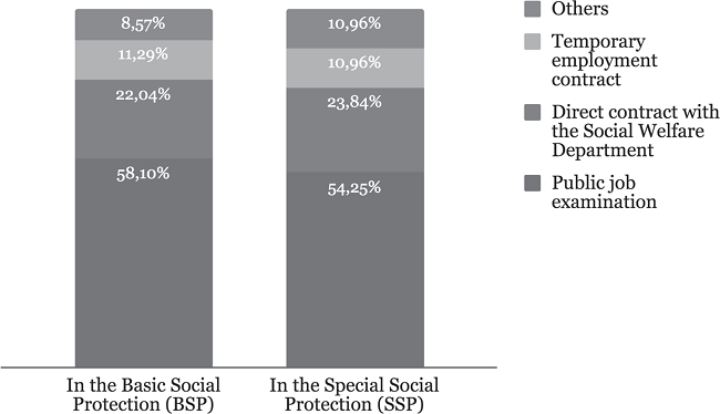 Regarding the form of entrance into social assistance of the participants of this study, a high index of participants was found: 56.8% of the participants went through a public job examination and had a statutory contract. There was a similarity, in percentage terms, between the participants that work in BSP and those that worked in SSP, being 58.1% in the CRAS and 54.2% in the CREAS (Figure 1).