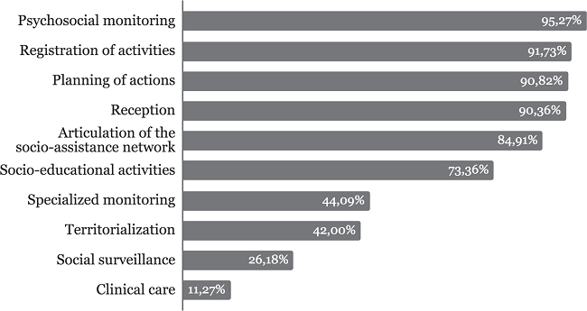 Considering the activities developed by the participants, the most cited were psychosocial monitoring, registration of activities, action planning and reception. Network articulation and socio-educational activities also appeared to be present in high percentages (above 70%). Clinical care, although not provided for in the technical norms, appears in the data collected, however, with low frequency (11.27%), as can be observed in Figure 2.