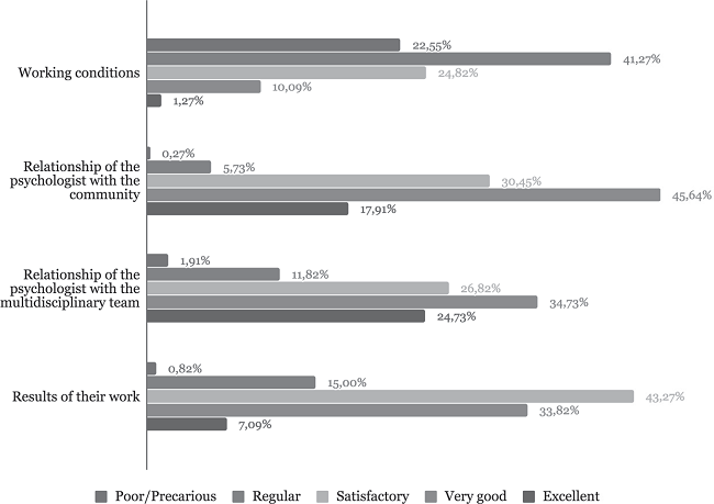 This study also investigated the assessments that professionals made of their work. The majority of respondents considered the working conditions to be regular (41%), although a large number (22.5%) consider them to be poor or precarious. Only a small percentage (1.2%) said these conditions were excellent. The psychologist's relationship with the community was considered very good by 45% and satisfactory by 30% of the sample. In the question regarding the psychologist's relationship with the team there was a slight variability among the percentages, with the majority of the sample (34%) considering this relationship to be very good. Regarding the results of the work, 43% considered them satisfactory, as can be seen in Figure 3.