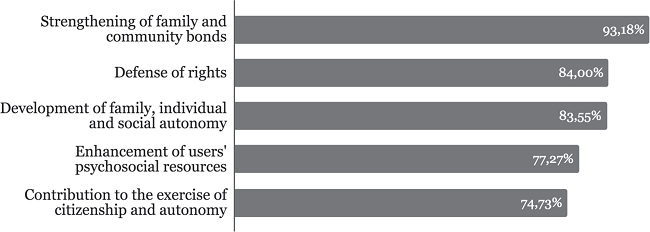 The five main results of the psychologists' work in these teams, according to the professionals' reports, were the strengthening of family and community bonds; defense of rights; development of family, individual and social autonomy; enhancement of users' psychosocial resources and contribution to the exercise of citizenship and autonomy, as shown in Figure 4.