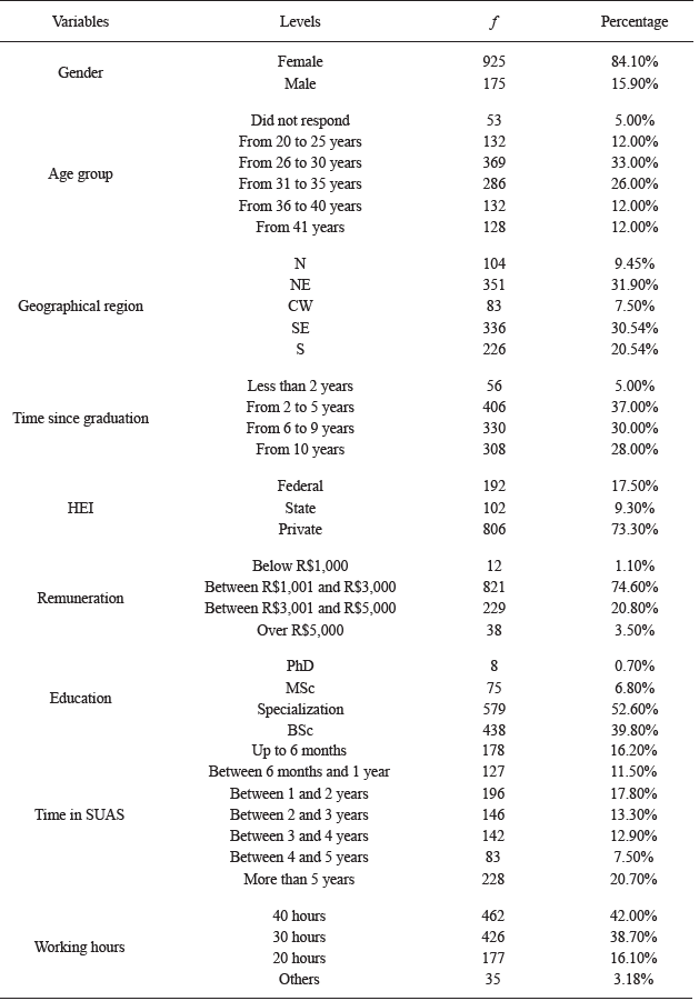Regarding the sociodemographic profile of the sample, 84.1% of the participants were women, with a mean age of 30 years (SD = 9.89 years) and mean time since graduation of 6 years (SD = 5.81); the majority graduated from private universities (73.3%), had worked in the SUAS for more than 5 years (20.7%) and worked between 30 and 40 hours per week (80.7%).