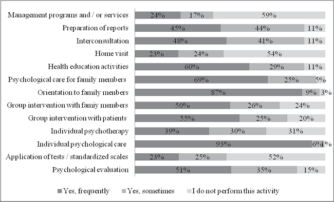 Considering the practices carried out frequently or occasionally in the professional quotidian, Figure 1 presents the distribution of these performed frequently, occasionally and not performed. The most frequent practices cited were: individual psychological care (n=87; 93%), guidance to family members/caregivers of patients (n=81; 87%), psychological care to family members/caregivers (n=65; 69%), health education activities (n=55; 59%) and care/interventions in a group of patients (n=51; 55%). There was a low frequency of the use of standardized tests and scales, with 52% of the psychologists saying they did not use these types of instruments and 25% mentioning occasional use.