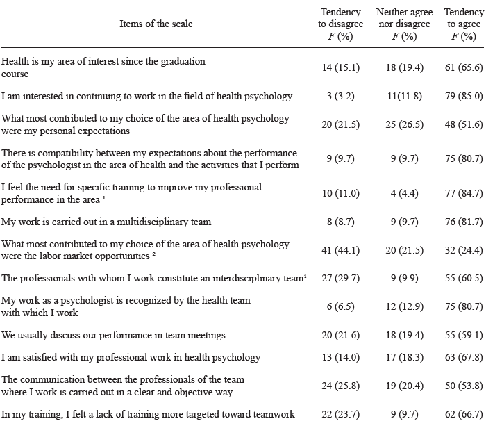Table 1 shows the distribution of responses to the thirteen items, grouped into three levels: tendency to agree, midpoint and tendency to disagree. There was a tendency to agree with many of the statements, with emphasis on the interest in continuing to work in the health area, which accounted for 85% of the responses. A high percentage of disagreement (29.7%) was observed in the item that indicated that the professionals with whom the psychologists worked were an interdisciplinary team, as well as in the item that mentioned communication among the professionals (25.8%). These results show challenges in the context of relationships and communication among the team members, from the perspective of the participants. The statement that "the thing that most contributed to my choice of the health psychology area was the labor market opportunities" had the highest percentage of disagreement (44.1%), indicating that it was not the possibilities of the market that led to choosing the work, but personal interests and choices.