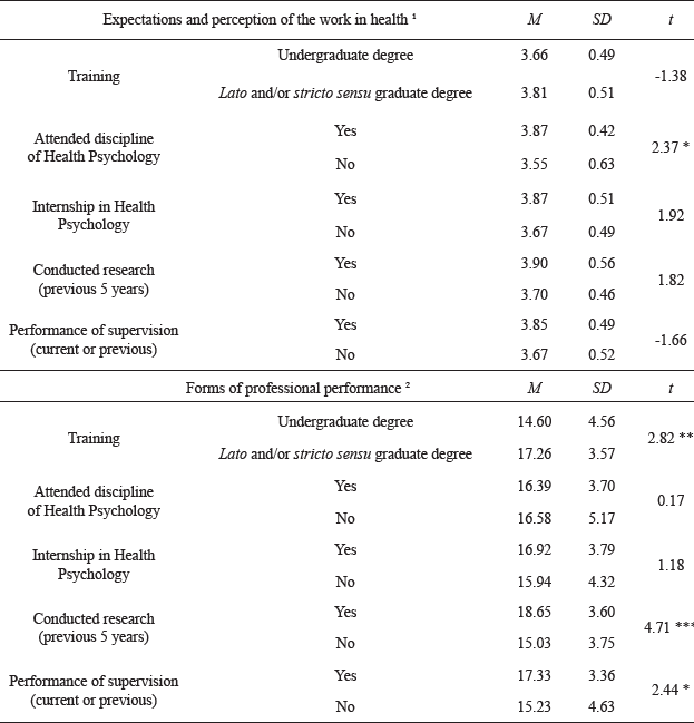 As the two variables of interest ? perceptions and expectations about work in health and forms of professional performance ? did not violate assumptions about normality, the subsequent bivariate analyses were performed using parametric tests. Regarding the perceptions and expectations about the work, the results of Student's t-test showed that having attended an undergraduate health psychology discipline was associated with higher scores in this variable, with a statistically significant difference, while the other variables studied did not distinguished the two groups (Table 2). Regarding the forms of professional practice variable, higher mean scores, with statistically significant differences, were observed for professionals who had graduate degrees, performed research or supervised trainees and/or residents (Table 2). Having attended a health discipline and/or internship during the undergraduate course did not differentiate between those who reported a higher or lower diversity of professional practices.