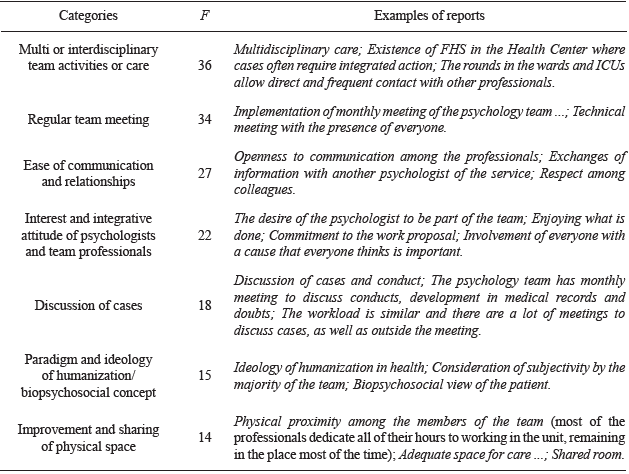 Other less frequent categories were: management that favored team integration (n=13); recognition of the psychologist's work (n=12); horizontality/respect/trust in the professional relationships (n=10); personal characteristics of the professionals (n=10); training and technical-scientific updates (n=7); autonomy and freedom to take decisions (n=7); compatible working hours (n=6); qualification of the professionals (n=5); length of working in the service (n=5).
