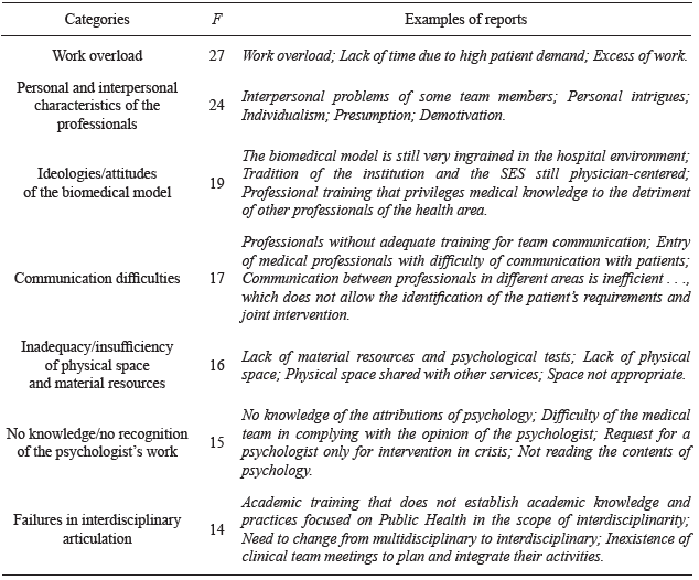 Regarding the aspects that hampered the integration of the team, the most frequent categories and their respective illustrative examples are presented in Table 4. Other categories identified in the responses of the participants were: human resources shortages (n=13); lack of training/continuing education (n=12); management problems/limitations (n=10); stress/burnout (n=8); conflicts between professionals (n=4); training that does not support interdisciplinary work (n=1) and characteristics of the work process (n=38). This category was divided into subcategories, such as: incompatibility of hours/shifts (n=13); requirement for productivity statistics (n=9); bureaucracy (n=4); precariousness of the work (n=3); lack of interdisciplinary procedures (n=3); staff turnover (n=2); fragmentation of the work (n=2) and low remuneration (n=2).