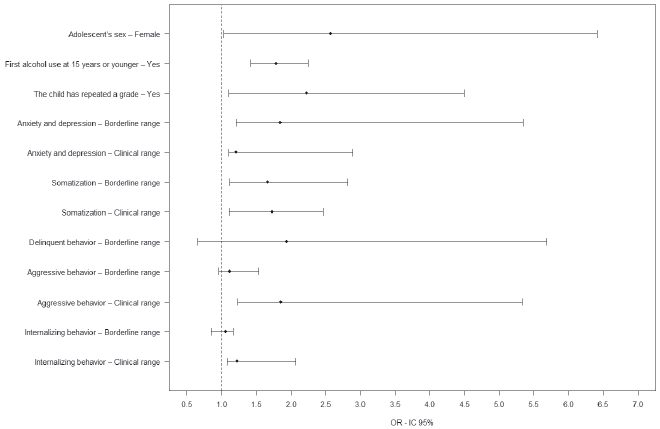 Regarding the evaluation of emotional and behavioral problems, there was a significant association with anxiety/depression (p < .05), indicating a higher risk of alcohol consumption for the borderline [odds ratio (OR): 1.84; 95% CI, 1.20-5.34] and clinical (OR: 1.20; 95% CI, 1.09-2.88) ranges. Similar results were obtained for somatization (p < .02; OR: 1.66; 95% CI, 1.11-2.81 and OR: 1.73; 95% CI, 1.11-2.47, respectively), aggressive behavior (p < .04; OR: 1.11; 95% CI, 0.95-1.53 and OR: 1.85; 95% CI, 1.22-5.33, respectively), and internalizing problems (p < .01; OR: 1.05; 95% CI, 0.84-1.16 and OR: 1.22; 95% CI, 1.01-2.07, respectively).