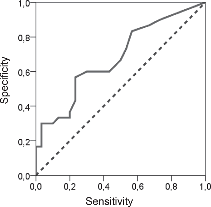 To determine the quality of fit of the logistic regression model, the area under the ROC curve was calculated. The logistic regression model had an area under the ROC curve estimated at 0.75 (95% CI, 0.63-0.82), which was considered satisfactory (above 0.70) and contributed to the assessment of the adequacy of the model to its purpose. The model had a sensitivity of 77.8% to accurately classify adolescents as alcohol users and a specificity of 81.5% to accurately classify adolescents as nonusers of alcohol (Figure 2).