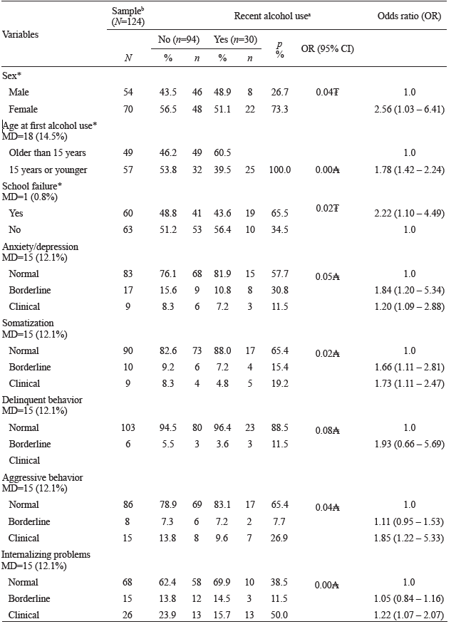 Abstract: Objective: It is known that alcohol use has increased both nationally and internationally. The present study was designed to evaluate the extent to wich sociodemographic characteristics, school performance, pattern of consumption and emotional health can predict the variable of interest, recent alcohol use, defined as the consumption of alcoholic beverages in the past 30 days, among adolescents from public schools in the metropolitan region of Porto Alegre/Rio Grande do Sul-Brazil. Methods: This was an observational, analytical, cross-sectional study of 124 students, 70 girls and 54 boys, aged 11 to 18 years. Participants were assessed in the classroom and completed a sociodemographic questionnaire, the Youth Self Report, and a questionnaire on drug use. Results: The variable with the greatest impact on recent alcohol use was total internalizing problems, anxiety/depression, and female sex. First alcohol use at 15 years or younger as well as school failure were also able to predict alcohol use. Conclusion: the data confirm the multidimensionality of the phenomenon that should be considered in prevention campaigns.
