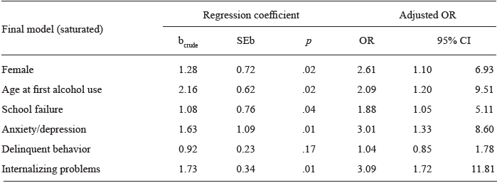 In order to detect which of the investigated variables had potential to predict recent alcohol use (past 30 days), binary logistic regression analysis using backward elimination was performed. To construct the initial (saturated) multivariate model, all variables with p-values ≤ 0.10 were used as predictive variables (Hosmer & Lemeshow, 2000), namely: sex (p < .04), age at first alcohol use (p < .001), school failure (p < .02), anxiety/depression (p < .05), somatization (p < .02), delinquent behavior (p < .08), aggressive behavior (p < .04), and internalizing problems (p < .001). Details are shown in Figure 1.
