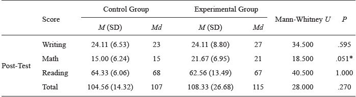 The results of the post-test assessment (Table 2) reveal that, subsequent to the intervention, the experimental group achieved scores that were very similar to those of the control group, except in relation to math skills, the comparative data of which demonstrate a tendency toward statistical significance, with clearly superior performance on the part of the experimental group, for the learning support lessons.