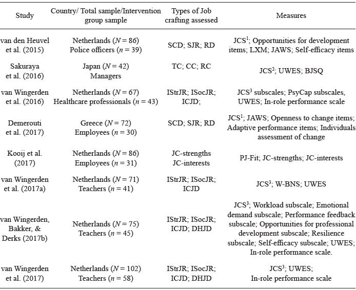 Research that seeks to evaluate the impact of job crafting interventions on individual and organizational outcomes is still scarce; however, evidence is accumulating regarding the differential effectiveness of stimulated job crafting behaviors (van Wingerden, Bakker, & Derks, 2017a). Although incipient, the research on job crafting interventions is promising, as it helps to uncover what employees do to alter their job characteristics and work meaningfulness, and the impact of such individual job crafting behaviors on well-being and job performance (Bakker & Demerouti, 2017). To the best of our knowledge, there was no literature review that focused specifically on examining the effects of job crafting interventions. Therefore, we present a systematic review that summarizes the findings of empirical quantitative studies examining the effects of job crafting interventions in organizations. We aim to offer a general and critical overview of the interventions and propose the research question: What are the benefits of job crafting interventions and which tendencies and gaps can be identified?