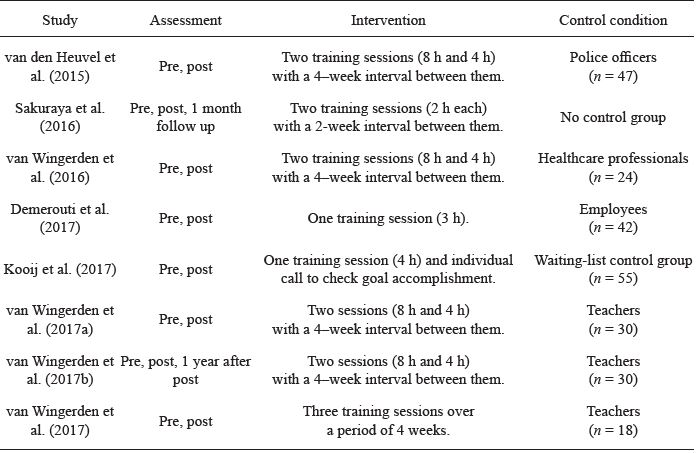 Table 2 summarizes the research design elements of the eight studies. Seven of these studies were quasi-experimental designs with control groups; just one study was longitudinal and analyzed the long-term effect of a job crafting intervention (van Wingerden et al., 2017b). All eight job crafting interventions took place in the employee's own work context, and all were carried out within one to three training sessions for minimum of three hours and maximum of 12 hours. Training sessions were always combined with the set-up of a self-chosen job crafting plan. Participants worked on achieving their personal job crafting goals in their work environment during a maximum of four weeks. In only one of the studies, training sessions were conducted outside of working hours (Sakuraya et al., 2016). Two studies included a personal resources training session combined with a job crafting training session to test the effects of both interventions on outcomes of interest (van Wingerden et al., 2016; van Wingerden et al., 2017).